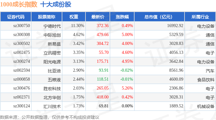 证券之星消息,11月25日,1000成长(399630)指数报收于1675.97点,涨1.82%,成交3077.5亿元,换手率2.35%。当日该指数成份股中,上涨的有253家,欧陆通以15.46%的涨幅领涨,下跌的有74家,京基智农以10.03%的跌幅领跌。