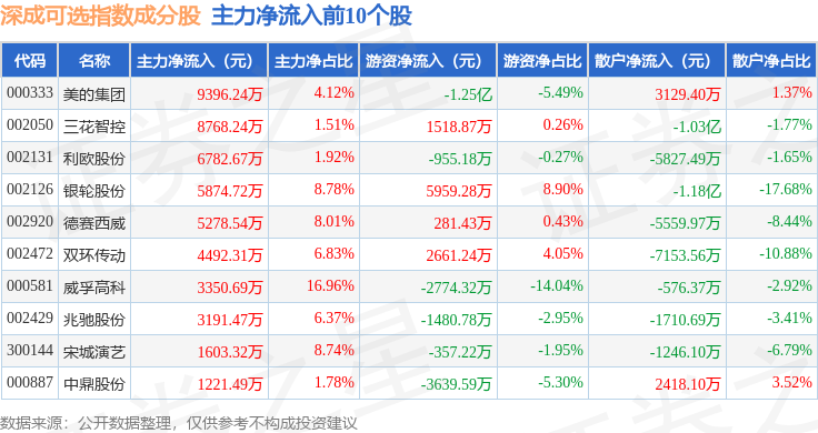 资金流向方面,深成可选(399683)指数成份股当日主力资金净流出合计15.37亿元,游资资金净流入合计5.36亿元,散户资金净流入合计10.02亿元。成份股资金流向详情见下表:
