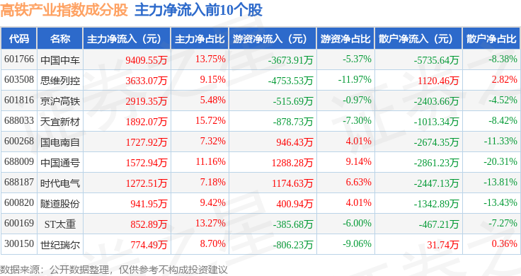 资金流向方面,高铁产业(399807)指数成份股当日主力资金净流入合计1.41亿元,游资资金净流出合计5016.18万元,散户资金净流出合计9061.03万元。成份股资金流向详情见下表: