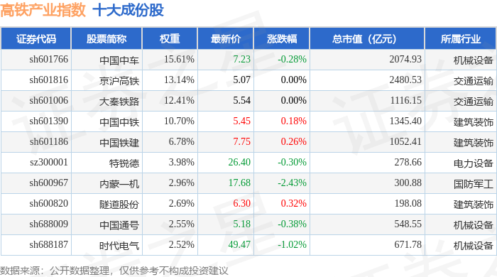 高铁产业(399807)指数十大成份股详情如下: