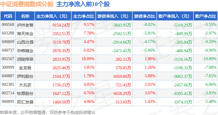 资金流向方面,中证消费(399932)指数成份股当日主力资金净流出合计3.08亿元,游资资金净流入合计5.9亿元,散户资金净流出合计2.82亿元。成份股资金流向详情见下表: