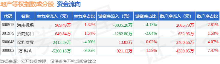 资金流向方面,地产等权(399983)指数成份股当日主力资金净流出合计6054.43万元,游资资金净流出合计3383.93万元,散户资金净流入合计9438.36万元。成份股资金流向详情见下表: