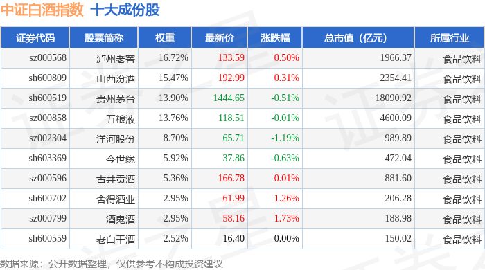 证券之星消息,11月25日,中证白酒(399997)指数报收于9659.62点,涨0.05%,成交104.67亿元,换手率0.58%。当日该指数成份股中,上涨的有12家,酒鬼酒以1.73%的涨幅领涨,下跌的有5家,洋河股份以1.19%的跌幅领跌。