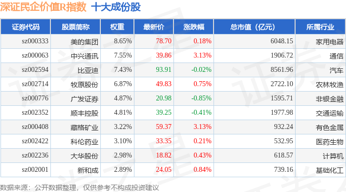 深证民企价值R(470072)指数十大成份股详情如下: