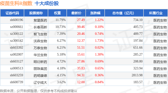 证券之星消息,11月25日,疫苗生科R(480015)指数报收于7969.39点,涨0.82%,成交191.15亿元,换手率0.99%。当日该指数成份股中,上涨的有41家,华兰疫苗以11.25%的涨幅领涨,下跌的有8家,派林生物以1.69%的跌幅领跌。