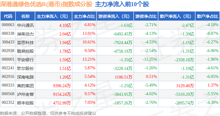 资金流向方面,深港通绿色优选R(港币)(483012)指数成份股当日主力资金净流入合计11.64亿元,游资资金净流出合计4.27亿元,散户资金净流出合计7.38亿元。成份股资金流向详情见下表: