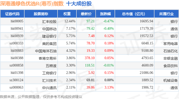 深港通绿色优选R(港币)(483012)指数十大成份股详情如下:
