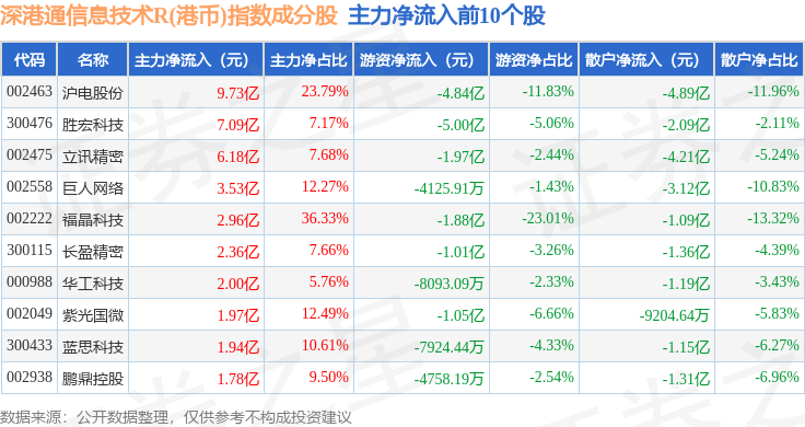 资金流向方面,深港通信息技术R(港币)(483028)指数成份股当日主力资金净流入合计21.18亿元,游资资金净流出合计27.93亿元,散户资金净流入合计6.75亿元。成份股资金流向详情见下表: