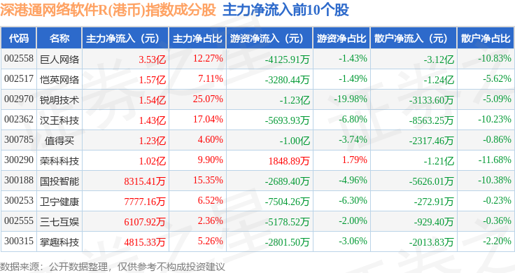 资金流向方面,深港通网络软件R(港币)(483048)指数成份股当日主力资金净流出合计8.91亿元,游资资金净流出合计6.47亿元,散户资金净流入合计15.39亿元。成份股资金流向详情见下表: