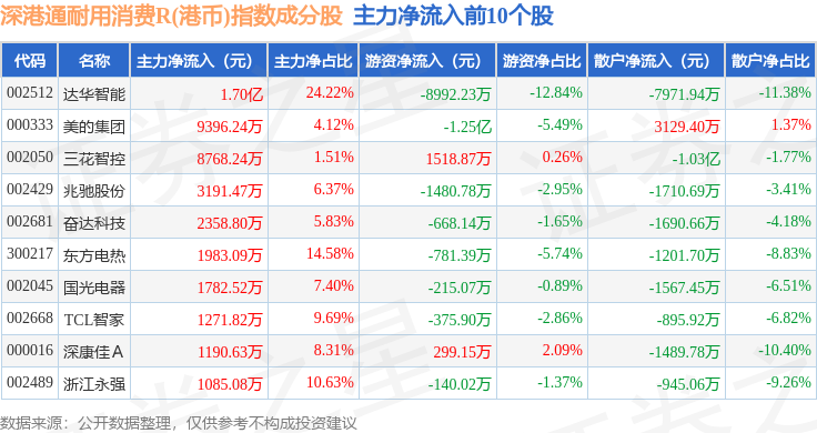 资金流向方面,深港通耐用消费R(港币)(483050)指数成份股当日主力资金净流入合计1.08亿元,游资资金净流出合计9605.41万元,散户资金净流出合计1177.15万元。成份股资金流向详情见下表: