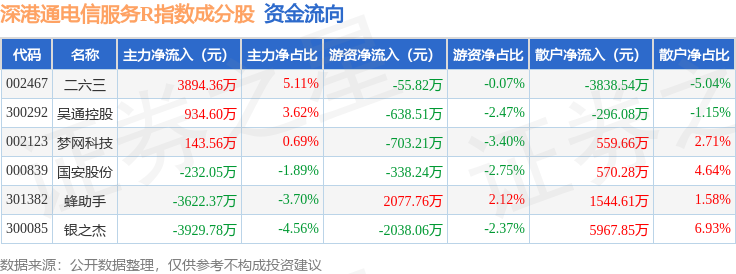 资金流向方面,深港通电信服务R(483057)指数成份股当日主力资金净流出合计2811.7万元,游资资金净流出合计1696.09万元,散户资金净流入合计4507.79万元。成份股资金流向详情见下表: