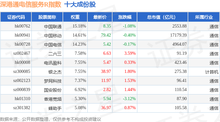 深港通电信服务R(483057)指数十大成份股详情如下: