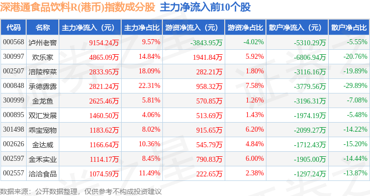 资金流向方面,深港通食品饮料R(港币)(483066)指数成份股当日主力资金净流入合计2.1亿元,游资资金净流入合计1.01亿元,散户资金净流出合计3.11亿元。成份股资金流向详情见下表: