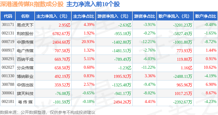 资金流向方面,深港通传媒R(483075)指数成份股当日主力资金净流出合计29.74亿元,游资资金净流入合计6.91亿元,散户资金净流入合计22.83亿元。成份股资金流向详情见下表: