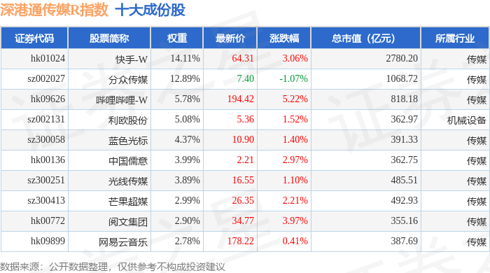 证券之星消息,11月25日,深港通传媒R(483075)指数报收于2441.09点,涨1.12%,成交640.08亿元,换手率4.95%。当日该指数成份股中,上涨的有31家,易点天下以6.55%的涨幅领涨,下跌的有12家,汇量科技以10.09%的跌幅领跌。