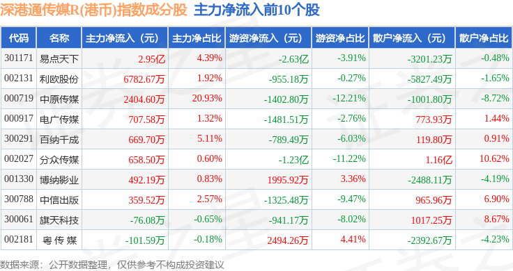 资金流向方面,深港通传媒R(港币)(483076)指数成份股当日主力资金净流出合计29.74亿元,游资资金净流入合计6.91亿元,散户资金净流入合计22.83亿元。成份股资金流向详情见下表:
