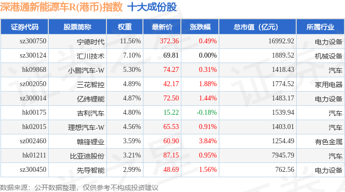 深港通新能源车R(港币)(483088)指数十大成份股详情如下: