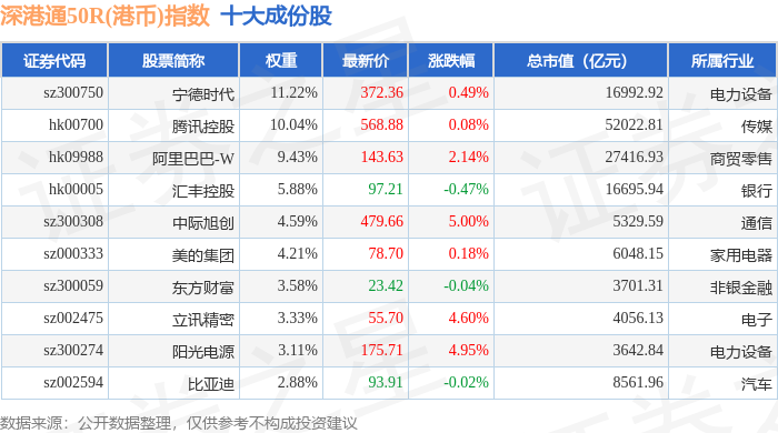 深港通50R(港币)(483092)指数十大成份股详情如下: