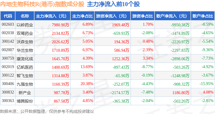 资金流向方面,内地生物科技R(港币)(483102)指数成份股当日主力资金净流入合计6482.7万元,游资资金净流入合计7882.82万元,散户资金净流出合计1.44亿元。成份股资金流向详情见下表: