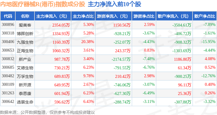 资金流向方面,内地医疗器械R(港币)(483104)指数成份股当日主力资金净流出合计7537.48万元,游资资金净流出合计2481.67万元,散户资金净流入合计1.0亿元。成份股资金流向详情见下表: