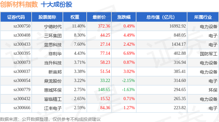 创新材料(970039)指数十大成份股详情如下: