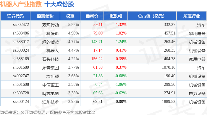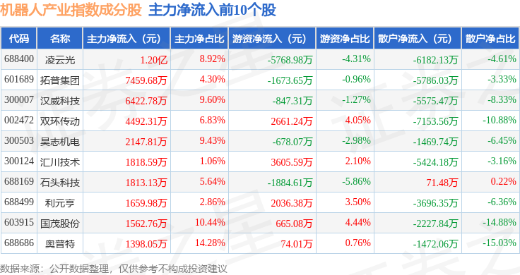 资金流向方面,机器人产业(980022)指数成份股当日主力资金净流出合计1449.12万元,游资资金净流入合计1.47亿元,散户资金净流出合计1.32亿元。成份股资金流向详情见下表:
