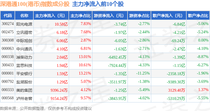资金流向方面,深港通100(港币)(983008)指数成份股当日主力资金净流入合计26.01亿元,游资资金净流出合计15.18亿元,散户资金净流出合计10.83亿元。成份股资金流向详情见下表: