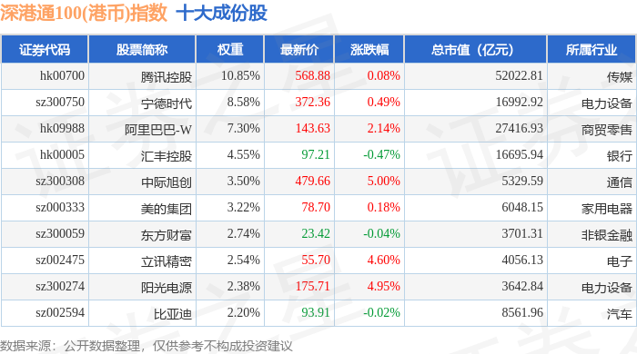 深港通100(港币)(983008)指数十大成份股详情如下: