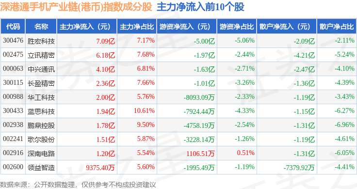 深港通手机产业链(港币)(983010)指数十大成份股详情如下: