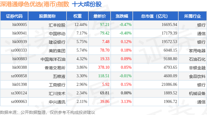 深港通绿色优选(港币)(983012)指数十大成份股详情如下: