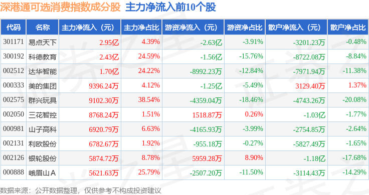 资金流向方面,深港通可选消费(983019)指数成份股当日主力资金净流出合计31.37亿元,游资资金净流入合计5.56亿元,散户资金净流入合计25.8亿元。成份股资金流向详情见下表: