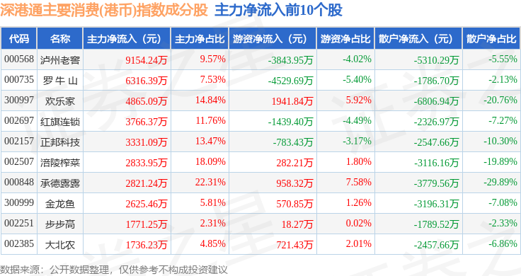 资金流向方面,深港通主要消费(港币)(983022)指数成份股当日主力资金净流出合计1.46亿元,游资资金净流入合计3.74亿元,散户资金净流出合计2.28亿元。成份股资金流向详情见下表:
