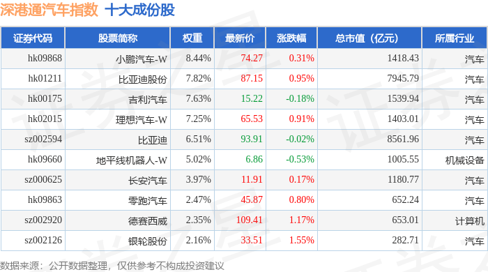 深港通汽车(983039)指数十大成份股详情如下: