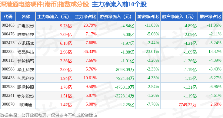 资金流向方面,深港通电脑硬件(港币)(983044)指数成份股当日主力资金净流入合计26.86亿元,游资资金净流出合计18.57亿元,散户资金净流出合计8.28亿元。成份股资金流向详情见下表: