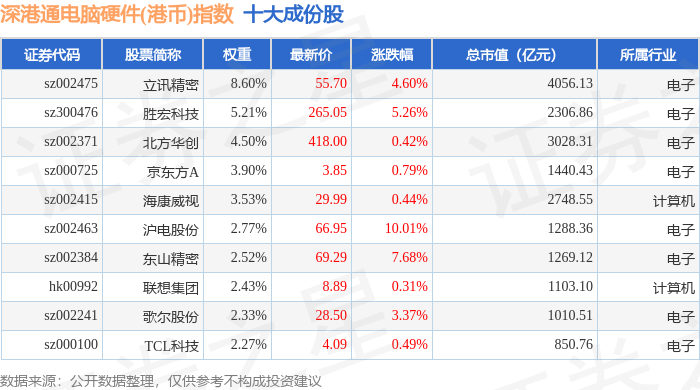 深港通电脑硬件(港币)(983044)指数十大成份股详情如下: