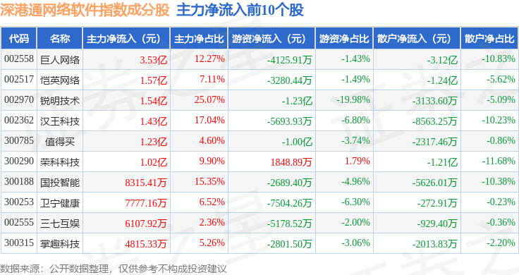 资金流向方面,深港通网络软件(983047)指数成份股当日主力资金净流出合计8.91亿元,游资资金净流出合计6.47亿元,散户资金净流入合计15.39亿元。成份股资金流向详情见下表: