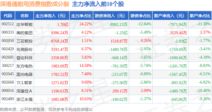 资金流向方面,深港通耐用消费(983049)指数成份股当日主力资金净流入合计1.08亿元,游资资金净流出合计9605.41万元,散户资金净流出合计1177.15万元。成份股资金流向详情见下表: