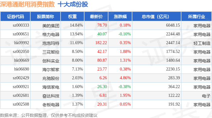 深港通耐用消费(983049)指数十大成份股详情如下: