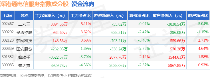 资金流向方面,深港通电信服务(983057)指数成份股当日主力资金净流出合计2811.7万元,游资资金净流出合计1696.09万元,散户资金净流入合计4507.79万元。成份股资金流向详情见下表: