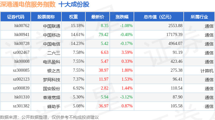 证券之星消息,11月25日,深港通电信服务(983057)指数报收于6148.5点,涨0.25%,成交48.76亿元,换手率0.45%。当日该指数成份股中,上涨的有7家,二六三以3.59%的涨幅领涨,下跌的有5家,香港宽频以3.12%的跌幅领跌。
