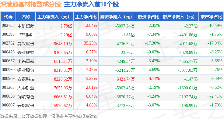 资金流向方面,深港通基材(983061)指数成份股当日主力资金净流入合计6.42亿元,游资资金净流出合计4065.82万元,散户资金净流出合计6.01亿元。成份股资金流向详情见下表: