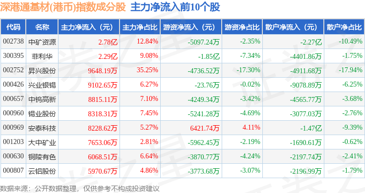 资金流向方面,深港通基材(港币)(983062)指数成份股当日主力资金净流入合计6.42亿元,游资资金净流出合计4065.82万元,散户资金净流出合计6.01亿元。成份股资金流向详情见下表: