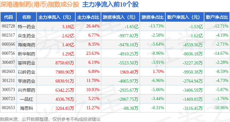 资金流向方面,深港通制药(港币)(983080)指数成份股当日主力资金净流入合计12.91亿元,游资资金净流出合计3.8亿元,散户资金净流出合计9.11亿元。成份股资金流向详情见下表: