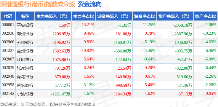 资金流向方面,深港通银行(港币)(983082)指数成份股当日主力资金净流入合计2.24亿元,游资资金净流出合计1.3亿元,散户资金净流出合计9457.32万元。成份股资金流向详情见下表: