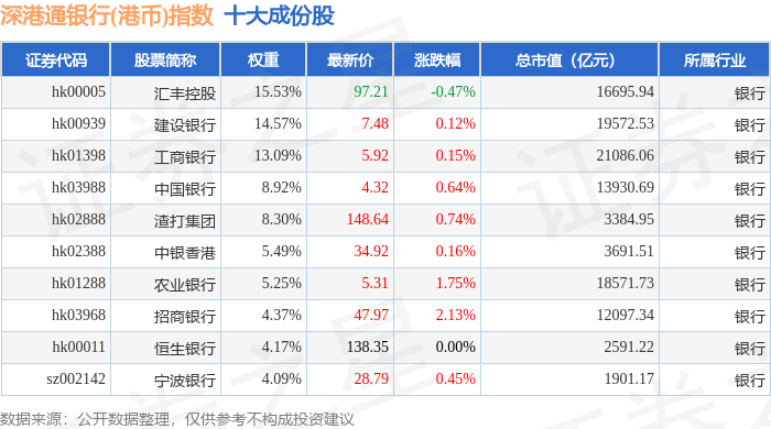深港通银行(港币)(983082)指数十大成份股详情如下: