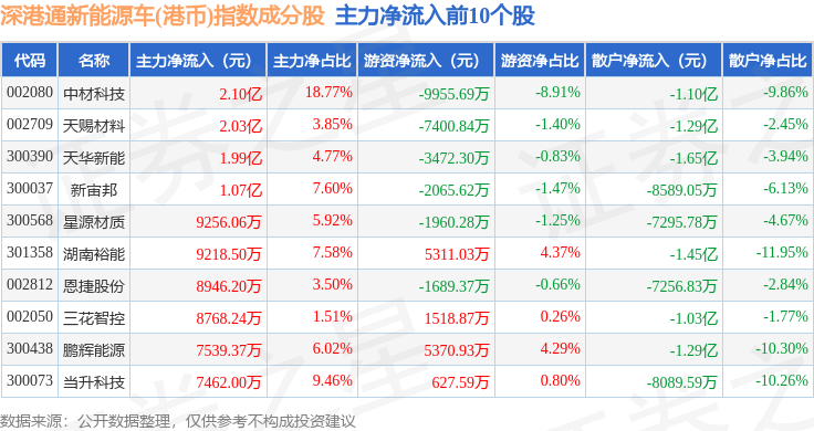 资金流向方面,深港通新能源车(港币)(983088)指数成份股当日主力资金净流入合计9.44亿元,游资资金净流入合计6.21亿元,散户资金净流出合计15.65亿元。成份股资金流向详情见下表: