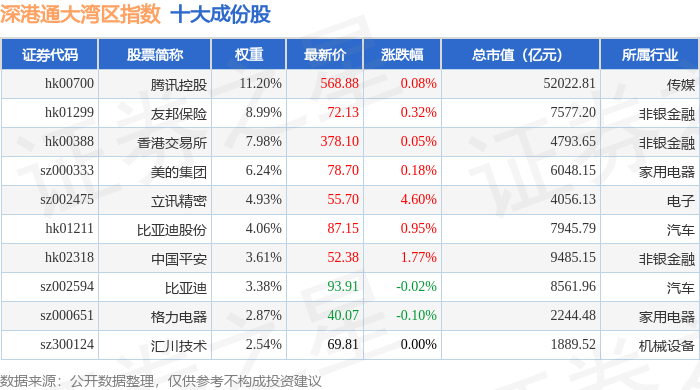 证券之星消息,11月25日,深港通大湾区(983089)指数报收于2583.14点,涨0.38%,成交539.7亿元,换手率0.45%。当日该指数成份股中,上涨的有31家,鹏鼎控股以5.56%的涨幅领涨,下跌的有16家,海大集团以3.41%的跌幅领跌。