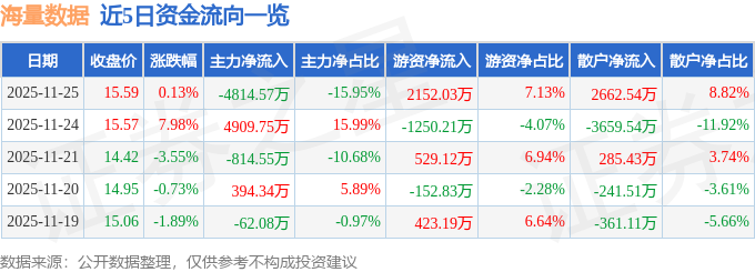 证券之星消息,截至2025年11月25日收盘,海量数据(603138)报收于15.59元,上涨0.13%,换手率6.66%,成交量19.21万手,成交额3.02亿元。
