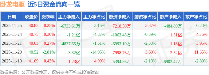 证券之星消息,截至2025年11月25日收盘,卧龙电驱(600580)报收于40.85元,上涨0.25%,换手率3.33%,成交量52.02万手,成交额21.4亿元。