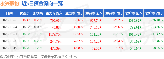 证券之星消息,截至2025年11月25日收盘,永兴股份(601033)报收于15.42元,上涨0.26%,换手率1.44%,成交量3.45万手,成交额5323.39万元。